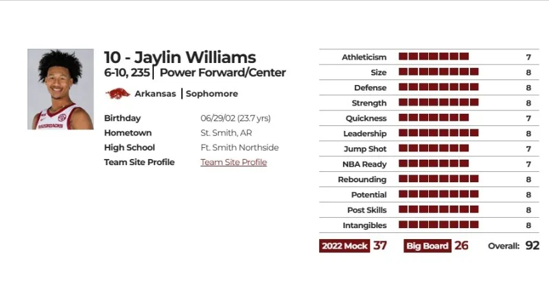 优点:一位不知疲倦的全能中锋,凭借防守意识和破坏力完美契合现代篮球风格,顶级进攻发起者,拥有出色的球场视野和精准的传球,大二赛季场均贡献2.6次助攻,能够运球突破,攻防两端灵活机动,有潜力将射程拓展到三分线外,卡位出色,具备成为一名优秀篮板手潜质,在阿肯色大学场均接近10篮板,防守意识极佳,是同届轮转换防和造进攻犯规能力最强的球员,本赛季共造成对手54次进攻犯规和48次抢断,防守全面性是他的最大优势,几乎可以防守任何位置球员,让球队防守战术可以灵活制定,在防守端起到带头作用,并拥有足够的体能进行长久作战。场均出战近32分钟,并且在控制犯规方面取得显著进步,只要在场上,就会全力以赴,并且能提升身边队友.