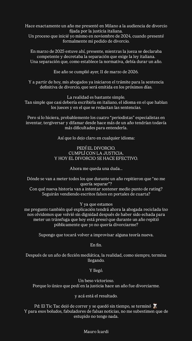 03月13日讯 当地时间3月12日,伊卡尔迪在社媒更新长文,宣布正式结束与旺达的婚姻,并透露自己在2024年11月提出了离婚申请,2025年3月判分居一年,如今一年期满,离婚已正式生效。伊卡尔迪长文:整整一年以前,我依照意大利司法机构的安排,在米兰出席了离婚听证会。这场程序由我本人于2024年11月启动,当时我正式提交了离婚申请。2025年3月,我亲自到场,...